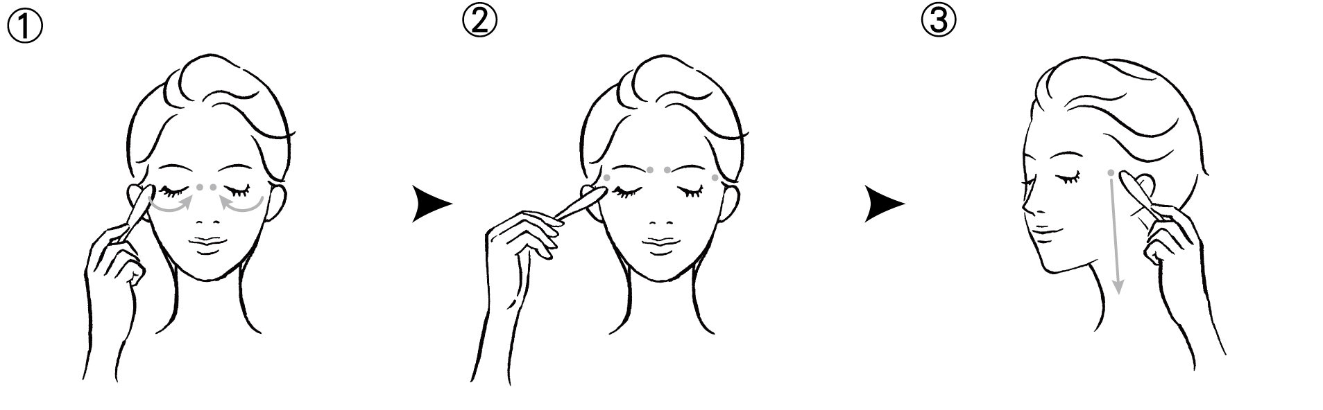 ① 目尻から目頭に沿って流すようにマッサージ。