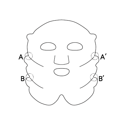 3. 続いて下段(B)をこめかみに向かって空気が入らないように強く引き上げ密着させます。上段(A)と重なっても構いません。