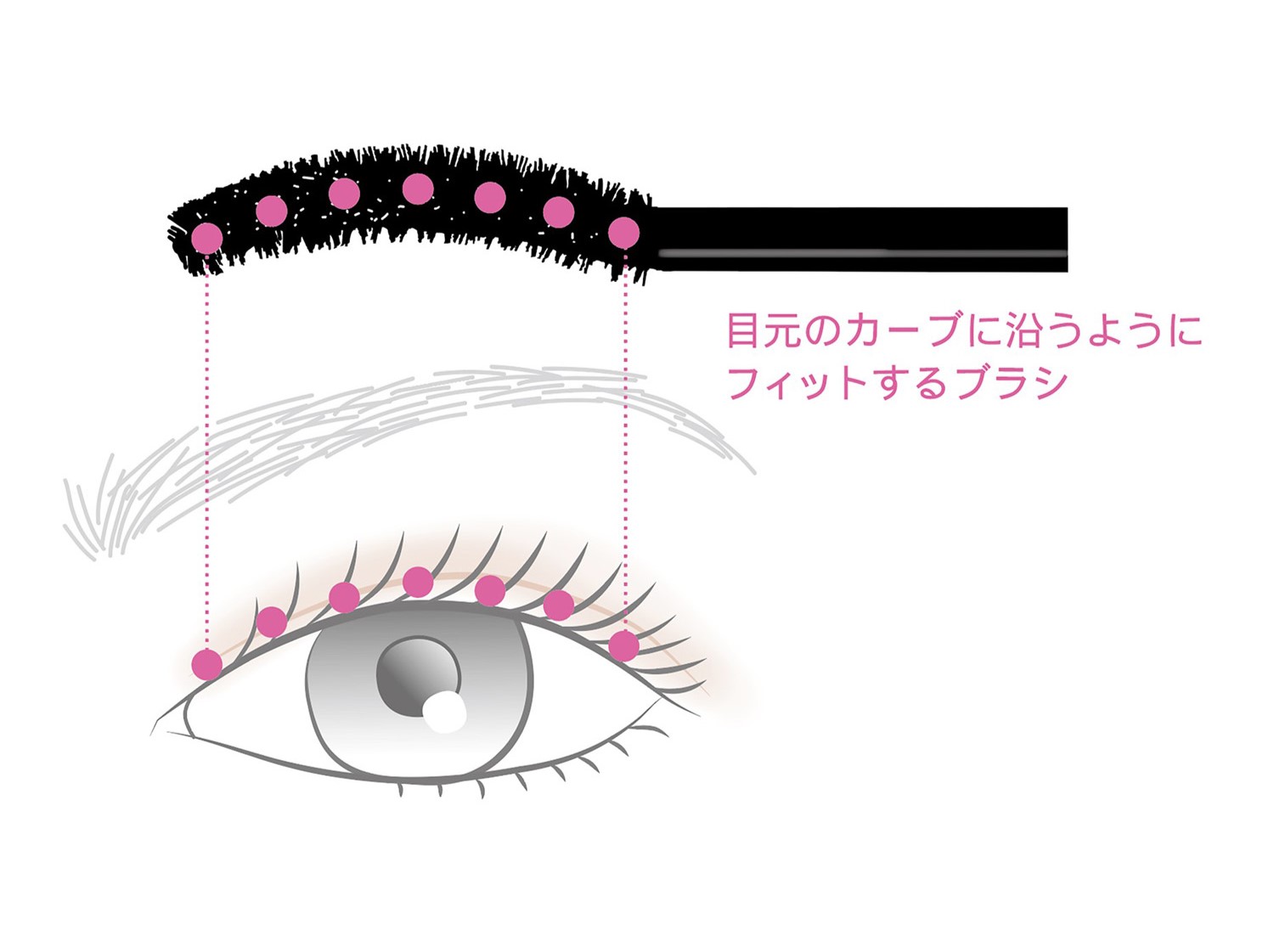 まつ毛の生え際のカーブに、ブラシのカーブを沿わせると、目元から毛先まで均一に塗りやすくなっています。